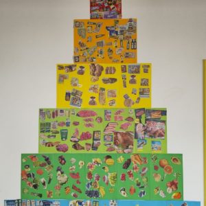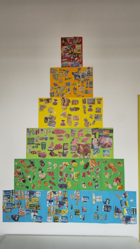 Die Klasse 2b beschäftigte sich ausgiebig mit der Ernährungspyramide. Die Schülerinnen und Schüler untersuchten dabei u.a. verschiedene Lebensmittel und reflektierten, wie viel sie ihrem eigenen Körper davon zuführen sollten, um sich gesund und ausgewogen ernähren zu können. Hierbei wurde den Kindern besonders bewusst, wie wichtig es ist, ausreichend zu trinken, und welche Getränke dem eigenen Körper guttun. Zum Abschluss der Projektwoche bastelten die Schülerinnen und Schüler gemeinsam eine große Ernährungspyramide für das Klassenzimmer, wobei die Kinder in kleineren Gruppen einzelne Lebensmittelgruppen der Ernährungspyramide auswählen durften und Supermarktprospekte auf zugehörige Lebensmittel durchsuchten. Nach dem Ausschneiden und Aufkleben auf Tonpapier wurden die einzelnen Teilbereiche an der Klassenzimmerwand zu einer großen Ernährungspyramide zusammengefügt, die nun für die Schülerinnen und Schüler ein täglicher und hilfreicher Wegbegleiter im Alltag sein sollte. (sn)