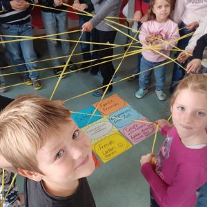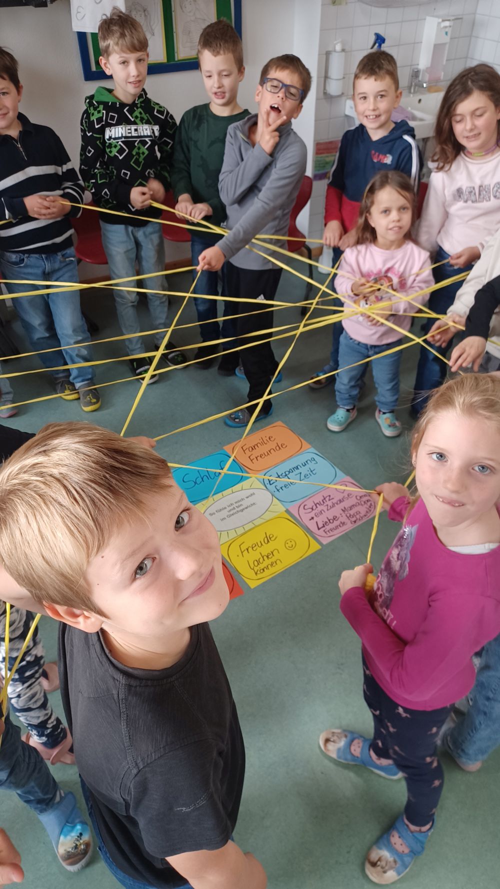 In der Klasse 2c war das Projektthema: „Was brauche ich, damit ich mich wohl fühle und im Gleichgewicht bin?“ Im Gespräch sammelten die Kinder Bereiche, die zu ihrer Gesundheit, bzw. zu ihrem Wohl beitragen: z.B. ausreichend Schlaf, Bewegung, Freunde, Freizeit, Entspannung, gesunde Ernährung, … Es entstand daraus ein „Wohlfühlteppich“ als Bodenbild. Sie stellten fest: Wenn ein Bereich fehlt, dann sind wir nicht mehr im Gleichgewicht. Dies veranschaulichten sie dann mit einem „Netzspiel“ aus Wolle. Jedes Kind musste ein Stück Faden der Wolle halten und dann das nächste Stück Faden weitergeben. Ließ nun einer den gespannten Faden fallen, dann zerfiel das Gleichgewicht und das Netz war beschädigt. In der konkreten Umsetzung nahmen man sich dann den Bereich „Entspannung“ vor. Die Kinder durften eine „Traumreise“ in den Herbstwald erleben. Zur Abrundung wurden schließlich auf dem Pausenhof Balanceübungen ausgeführt. Dabei waren die Kinder erstaunlich achtsam. (ij)