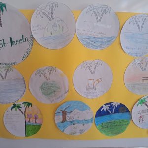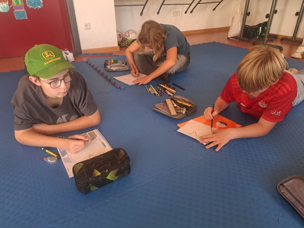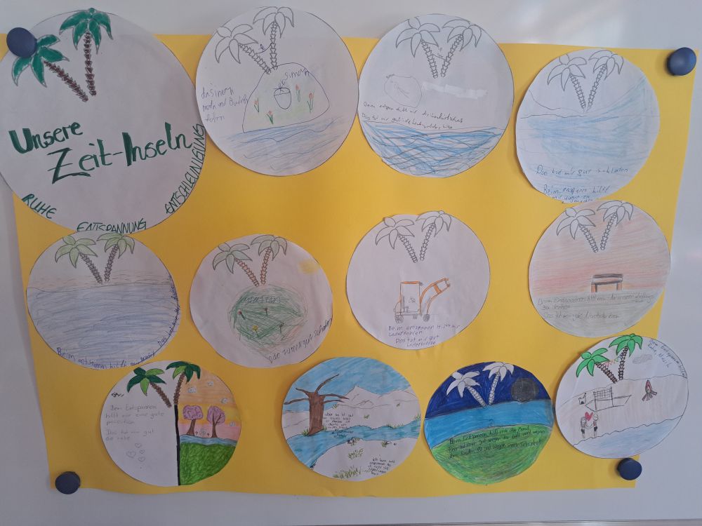 Im Rahmen der Woche der Gesundheit und Nachhaltigkeit durfte die Religionsgruppe der 7. Klasse eine besondere Erfahrung machen: eine meditative Fantasiereise an einen Ort der Ruhe – zu ihrer persönlichen Zeitinsel. Dazu wurde das Klassenzimmer kurzerhand in einen „Raum der Stille“ verwandelt. Bodenmatten ersetzten die Schulbänke, gedämpftes Licht und ruhige Musik schufen eine Atmosphäre der Entspannung. Fernab vom sonst oft hektischen Schulalltag tauchten die Schülerinnen und Schüler in eine geführte Meditation ein, die sie zu einem inneren Rückzugsort führte – einem Ort, an dem sie ganz für sich sein konnten. Im Schulalltag, der häufig von Reizüberflutung und Leistungsdruck geprägt ist, kann es hilfreich sein, zwischendurch innezuhalten. Wer regelmäßig solche Ruhepausen erlebt, entwickelt oft ein besseres Körpergefühl und einen gesünderen Umgang mit Stress. Nach der Meditation setzten sich die Jugendlichen kreativ mit ihrer Zeitinsel auseinander. In kleinen Kunstwerken und Stichpunkten hielten sie fest, wie dieser besondere Ort für sie aussieht – ein Strand, ein Wald oder sogar ein Ort in der Fantasie. Viele von ihnen berichteten, wie sie das Gefühl der Entschleunigung und inneren Ruhe mit in ihren Alltag nehmen konnten – ein kleines Stück Frieden, das sie auch nach der Schulstunde begleitet hat. Der Wunsch nach einer Wiederholung des Projektes war groß. Eine besondere Religionsstunde, die eindrucksvoll bewiesen hat: Manchmal braucht es nur einen Moment der Stille, um bei sich selbst anzukommen. (mie)