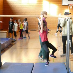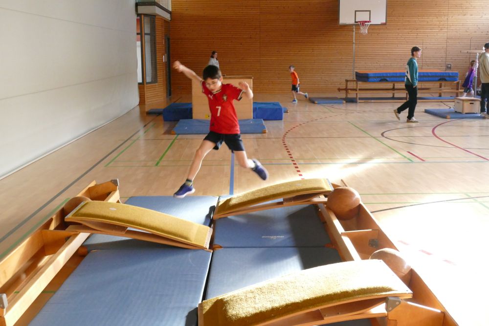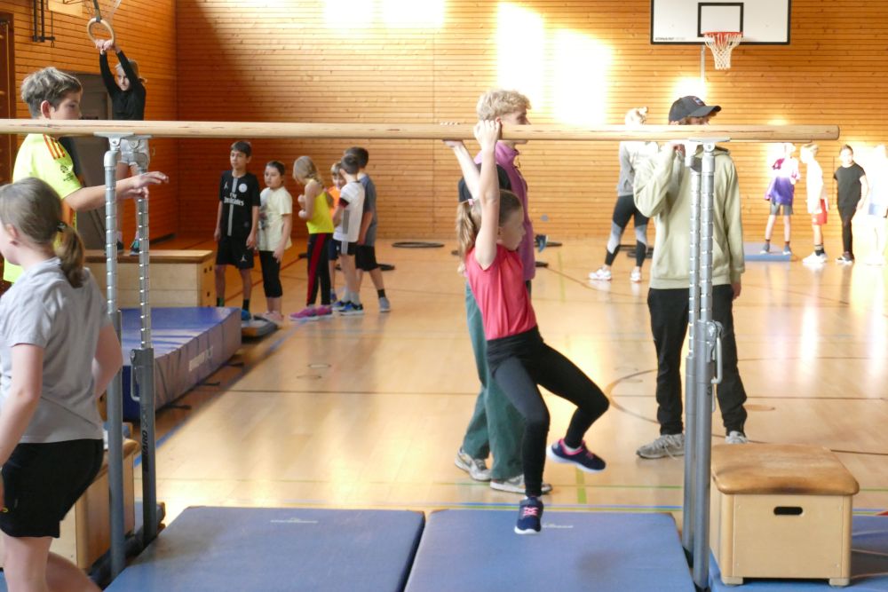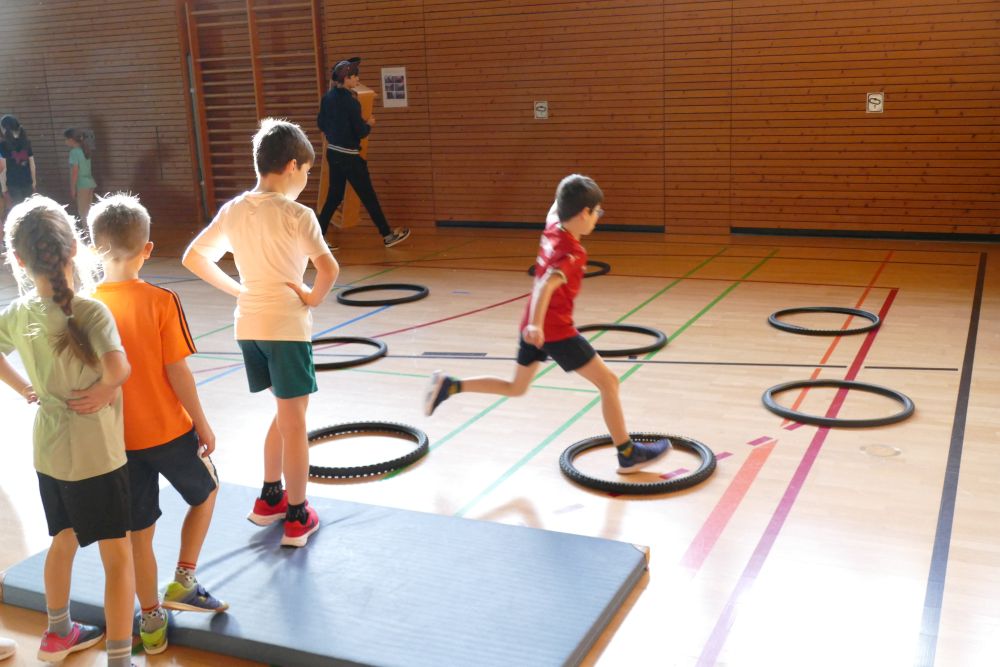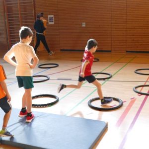 Die Studierenden überlegten im Vorfeld, welche Sportarten für die Kinder in diesem Alter besonders interessant und förderlich sein könnten. Ziel war es, die konditionellen Fähigkeiten der Schülerinnen und Schüler zu schulen und gleichzeitig den Spaß an der Bewegung zu fördern. Der Tag begann mit einem aufregenden Parcours, den die Kinder zunächst in ihrem eigenen Tempo erkunden konnten. In klasseninternen Duellen sowie im Wettkampf Schüler gegen Studierende wurde der Ehrgeiz geweckt. Die Atmosphäre war voller Begeisterung, und die Kinder überwanden sich beim Balancieren und Hangeln, während sie sich gegenseitig anfeuerten.