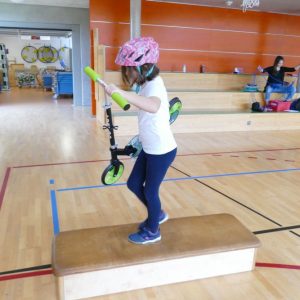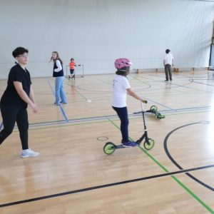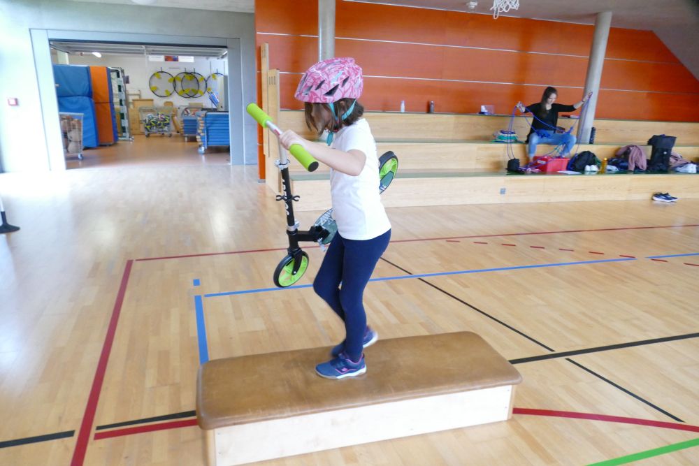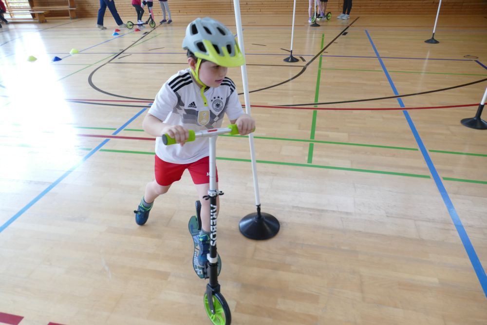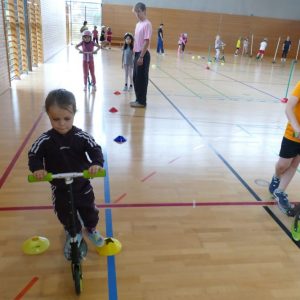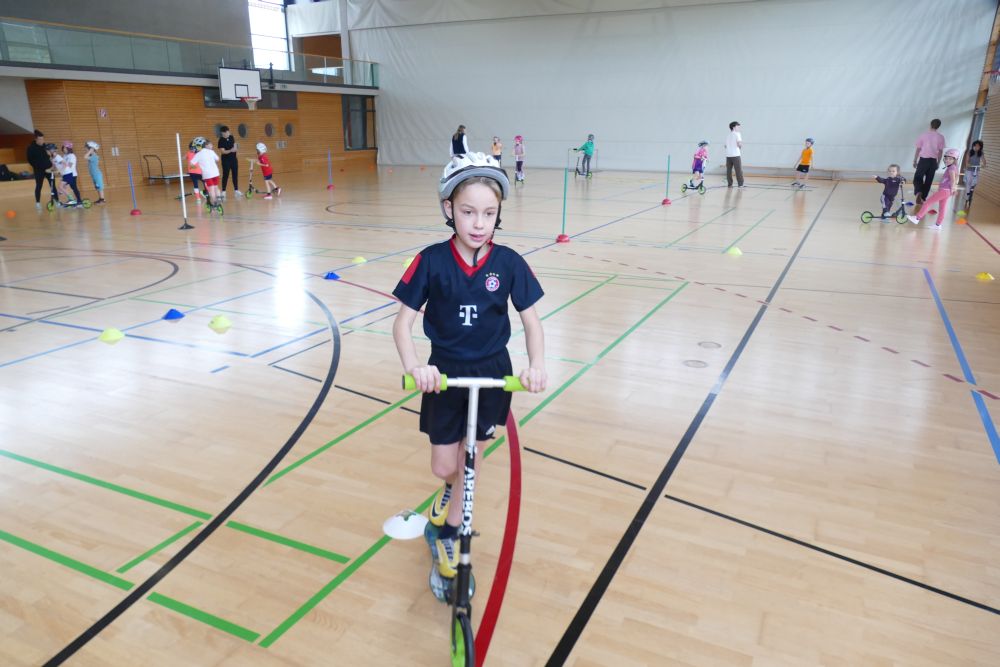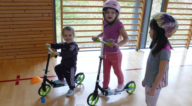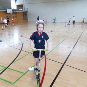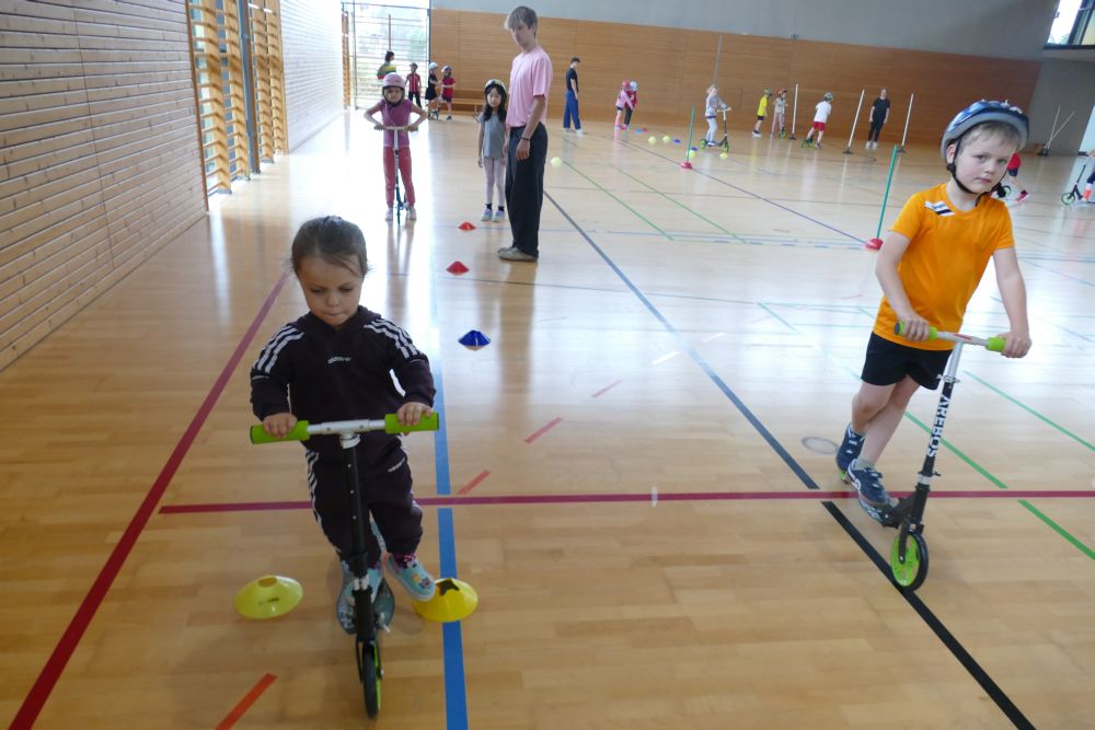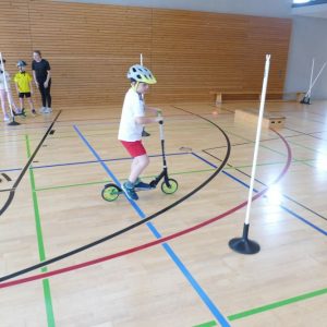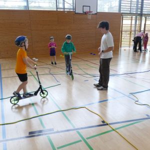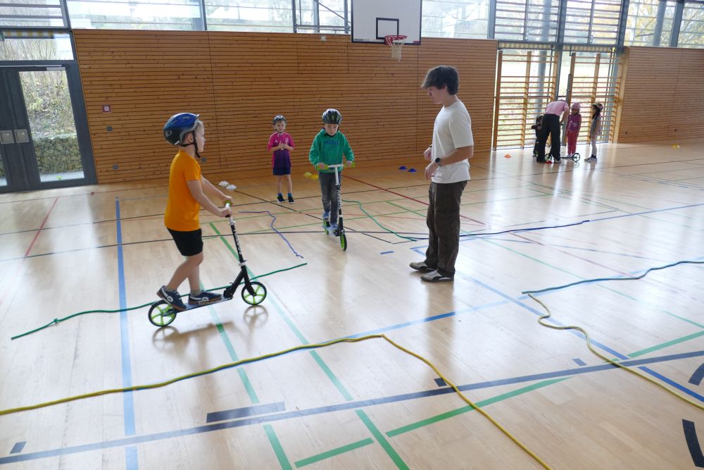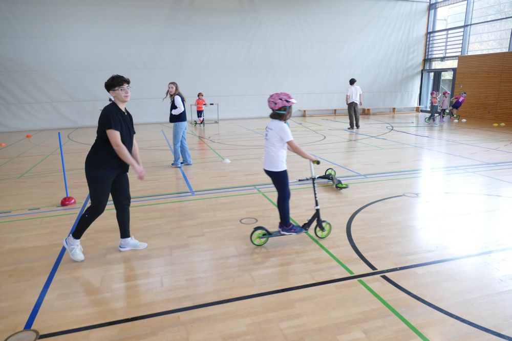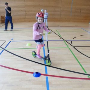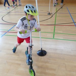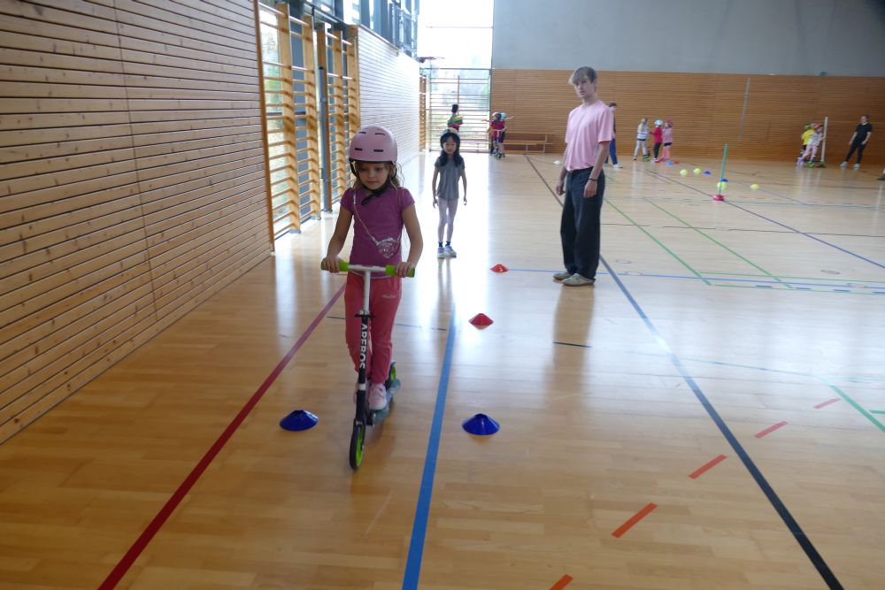 - Vertrauensübungen: In einem spannenden Teil der Stunde konnten die Kinder ihr Gleichgewicht blind auf dem Roller halten, während sie von einem Partner gehalten und geschoben wurden. Diese Übungen förderten nicht nur das Vertrauen in die eigenen Fähigkeiten, sondern auch die Teamarbeit.