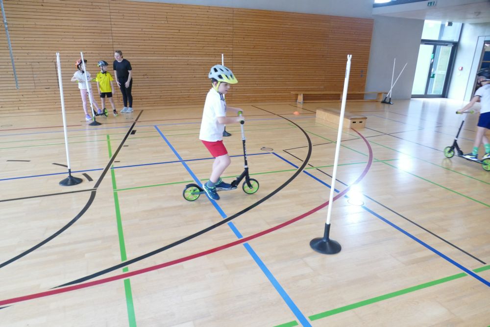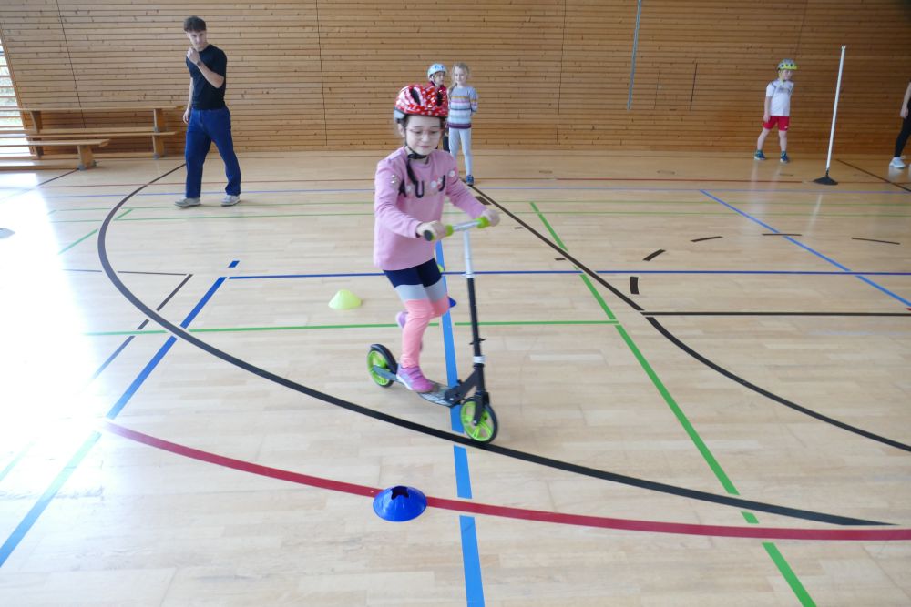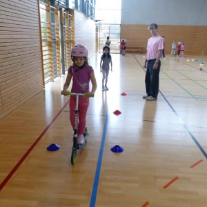 Der nächste Abschnitt der Stunde widmete sich praktischen Übungen mit dem Roller. An verschiedenen Stationen konnten die Kinder wichtige Fähigkeiten für den Straßenverkehr trainieren. Dazu gehörten:
