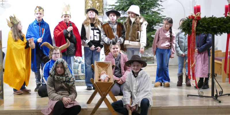 In der Pfarrkirche feierten die Grundschüler der Klassen 1 bis 6 einen festlichen Weihnachtsgottesdienst. Dieser wurde von Pfarrer Graeff und der Religionslehrerin Karolina Schmid liebevoll vorbereitet. Ein ganz besonderes Highlight war das vermeintlich improvisierte Krippenspiel, das von von Kindern der Theatergruppe aufgeführt wurde. Die jungen Darsteller übernahmen spontan alle Rollen und brachten die Weihnachtsgeschichte in beeindruckender Weise auf die Bühne. Die Vorbereitung des Krippenspiels lag in den Händen von Kerstin Neidhardt und Klaus Schmidmeister, die mit viel Kreativität und Enthusiasmus zur gelungenen Aufführung beitrugen. Für die musikalische Gestaltung sorgten Katharina Schneider am Klavier, Theresa Rieckhoff mit dem Cello und Luisa Schmidt mit einem wunderschönen Sologesang.