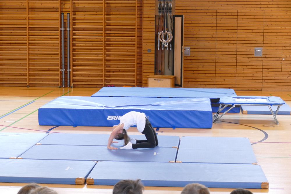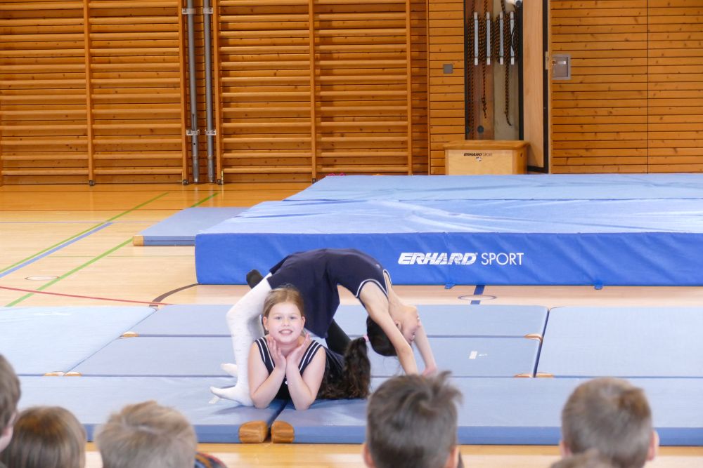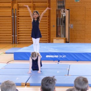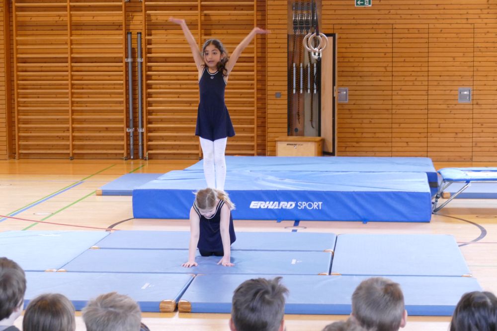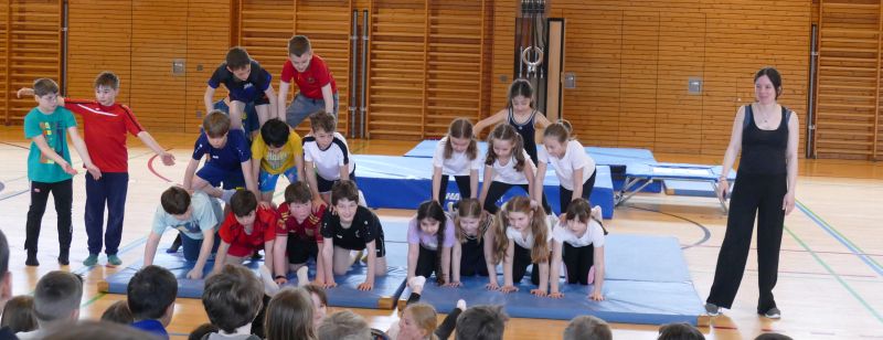 Die Klasse 3a hat gemeinsam mit ihrer Klassenlehrkraft Frau Neidhardt eine abwechslungsreiche Sportaufführung auf die Beine gestellt. Mit viel Freude und Engagement präsentierten die Schülerinnen und Schüler einen gemeinsamen Tanz sowie verschiedene Darbietungen aus den Bereichen Akrobatik und Artistik, die sie in kleinen Gruppen einstudiert hatten.