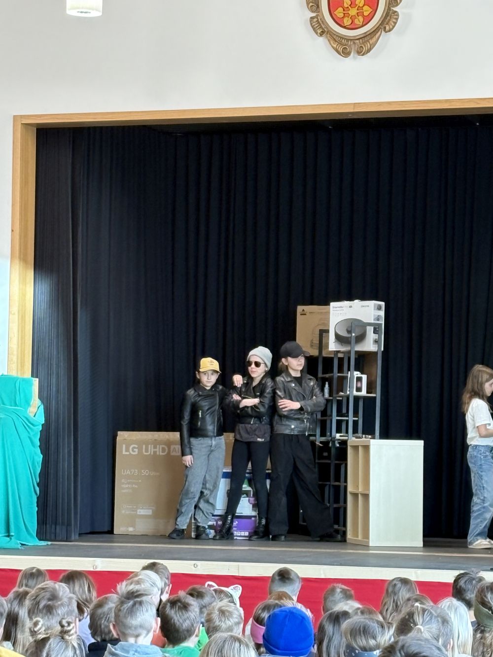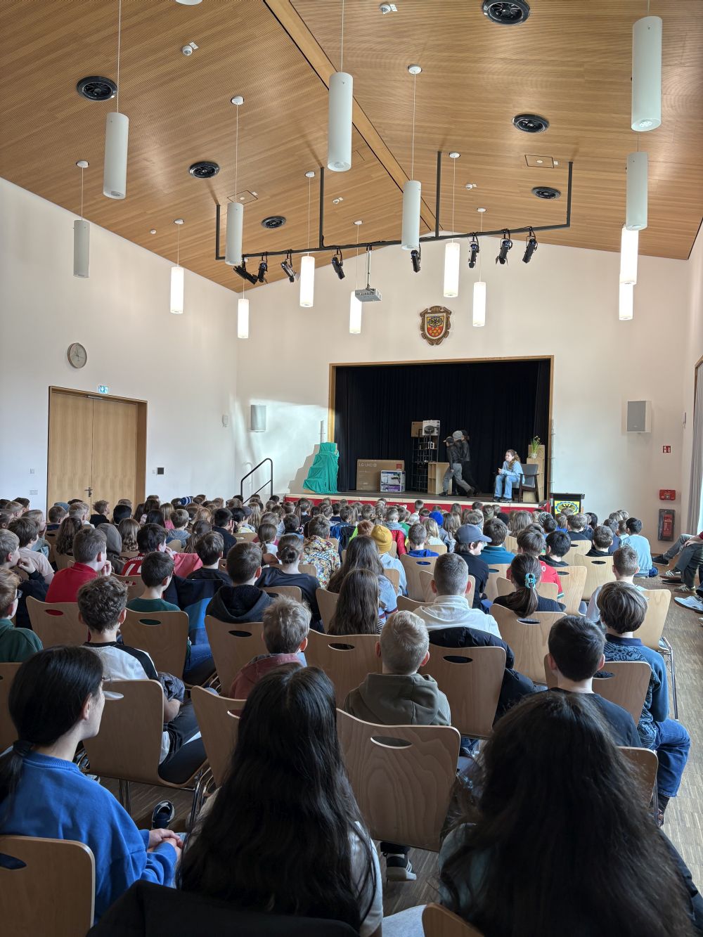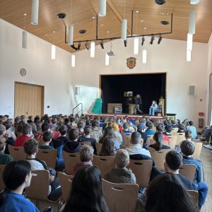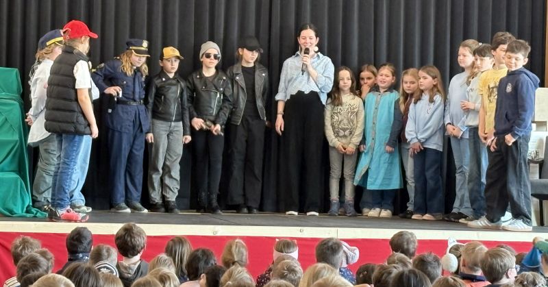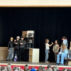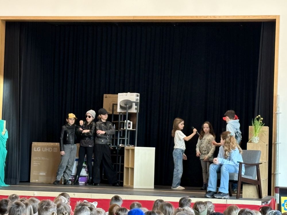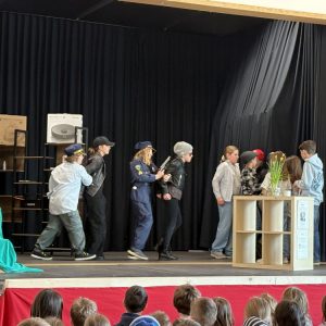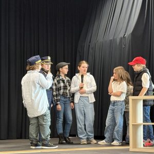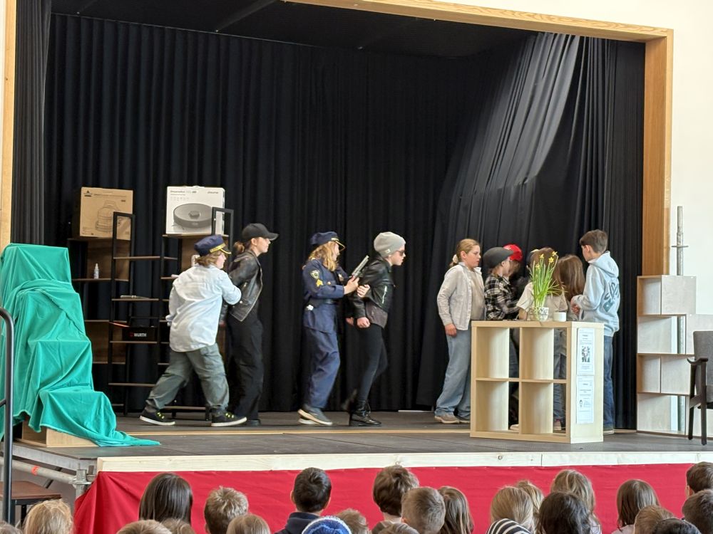 Mit dem packenden Kriminalstück „Eine aufregende Woche“, das von der Lehrerin, Regisseurin und Autorin Kerstin Neidhardt ursprünglich als Hörspiel verfasst und nun für das Theater umgeschrieben wurde, brachte unsere Theatergruppe in diesem Schuljahr Nervenkitzel auf die Bühne. Vier Kinder werden Zeugen eines Überfalls und geraten kurz darauf – scheinbar zufällig – auf die Spur der Täterbande. Als zwei der vier schließlich als Geiseln genommen werden, spitzt sich die Lage dramatisch zu. Im furiosen Finale befreit die Polizei die Kinder aus dem Unterschlupf der Verbrecher, einer verlassenen Scheune im Wald, und nimmt die drei Täter fest. Das Publikum hielt den Atem an – und spendete am Ende langanhaltenden Applaus. Besonders beeindruckend war, wie engagiert die Schülerinnen und Schüler nicht nur bei den Proben, sondern auch hinter den Kulissen arbeiteten. Bühnenbild und Requisiten wurden mit viel Liebe zum Detail gestaltet, die Kostüme sorgten für die passende Stimmung zwischen Ermittlungsfieber und Waldabenteuer. Für die betreuenden Lehrkräfte, Frau Neidhardt und Herrn Schmidmeister, war es eine Freude zu sehen, wie alle in ihren Rollen aufgingen und sichtbar über sich hinauswuchsen. Die Premiere fand am Abend des 26. März vor Familien und Eltern statt. Einen Tag später folgte die Aufführung für die Grundschule – ein gelungener Abschluss am letzten Schultag vor den Osterferien.